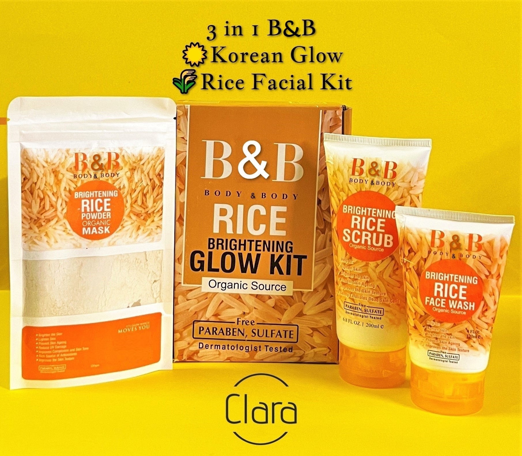 BNB Rice Facial Kit 3in1 Organic Brightening Glow Korean Face Scrub + Wash + Mask